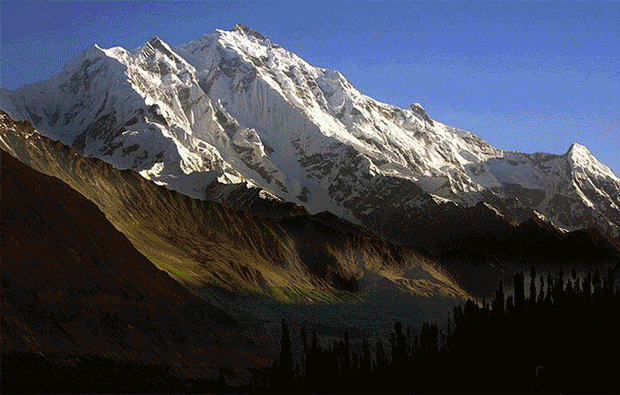 Rakaposhi, is a mountain in the Karakoram mountain range in Pakistan. |